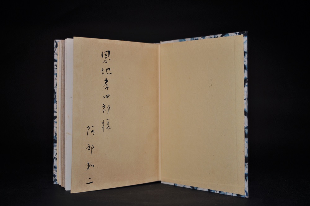 「紺青の紙と小豆色の布の貼り合せ。青文字・平の模様は金箔押し。箱の青・平は茶色ベタ刷りで文字白抜き。」(恩地邦郎・編『新装普及版 恩地孝四郎 装本の業』(三省堂サイト;https://www.sanseido-publ.co.jp/publ/gen/gen4lit_etc/onchi_sohonwaza/)掲載、邦郎によるコメント、113頁)。