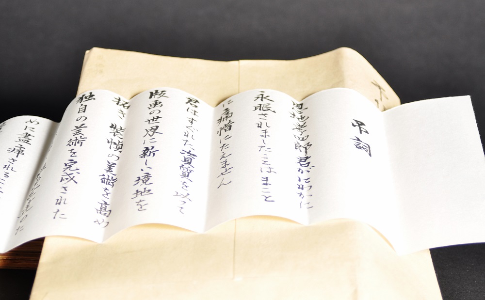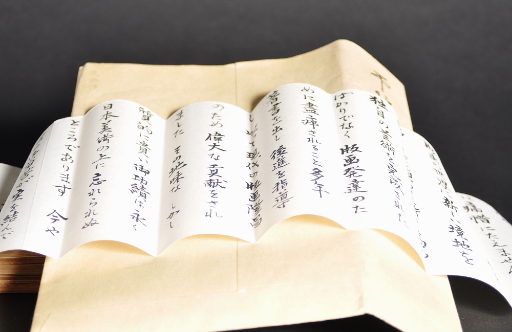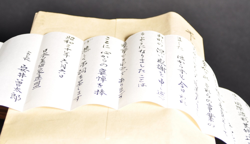 家にあるものは、いかにも整理されたようではなく自然にあるがままにというのが邦郎の考えで、この「弔詞」も、邦郎の手で「弔辞集」と書かれた厚手の封筒のなかに、美術関係者の弔辞、弔電名簿とともに納められ、孝四郎の装幀作品や蔵書とともに無造作に置かれていた。