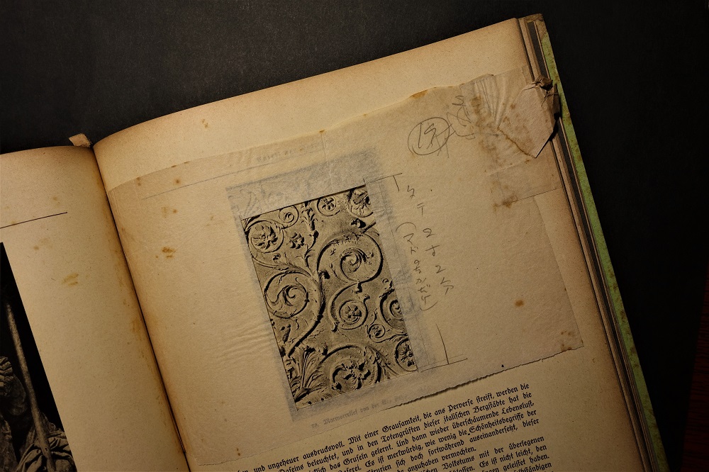 ジャック・ベルトラン(木版画)、フラゴナール、ルリユールの芸術的発展などが採りあげられているが、孝四郎の挟み込み箇所はペルシャ細密画のページ。図像は別刷りのものが貼り込まれており、美しい。