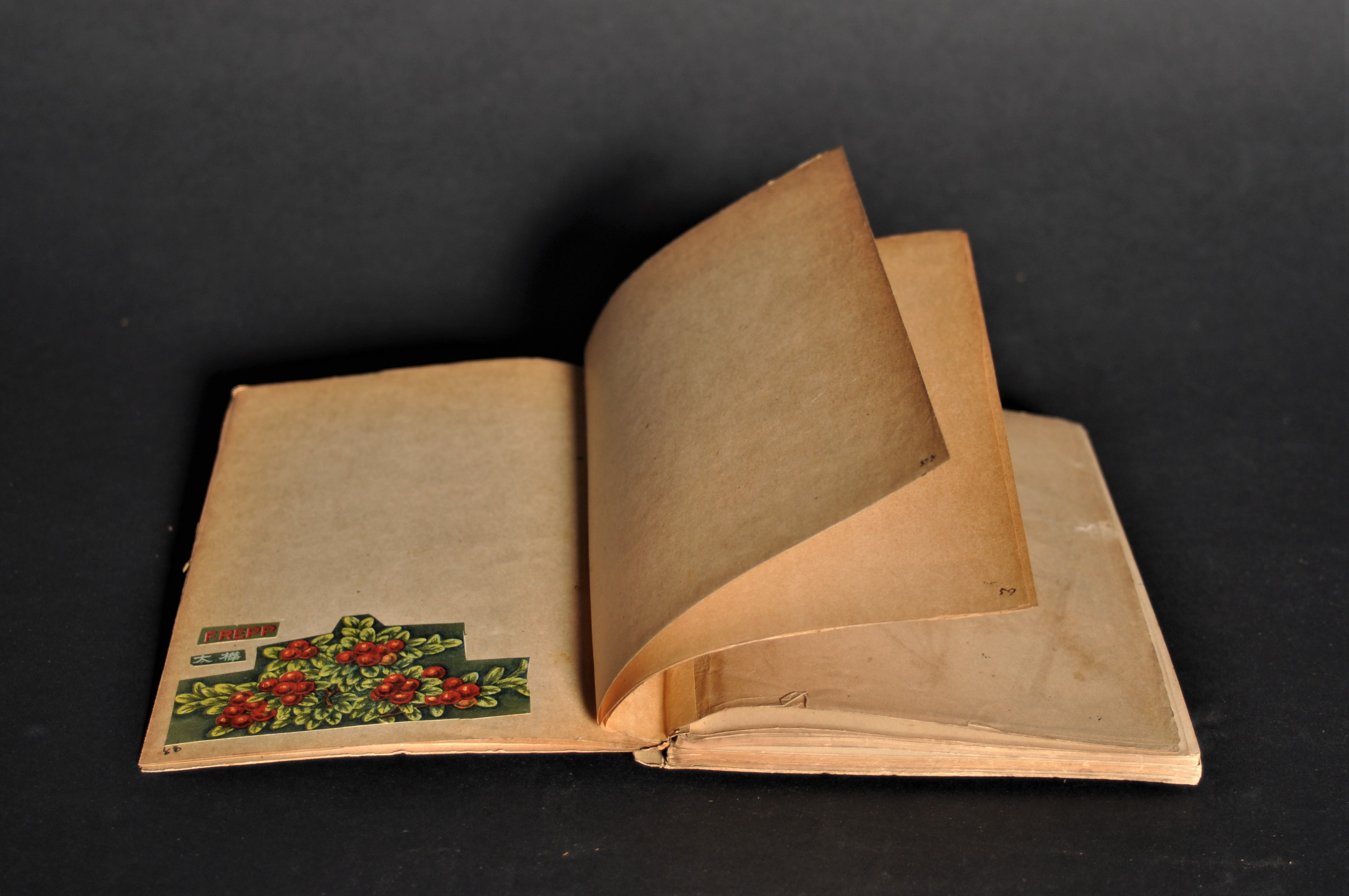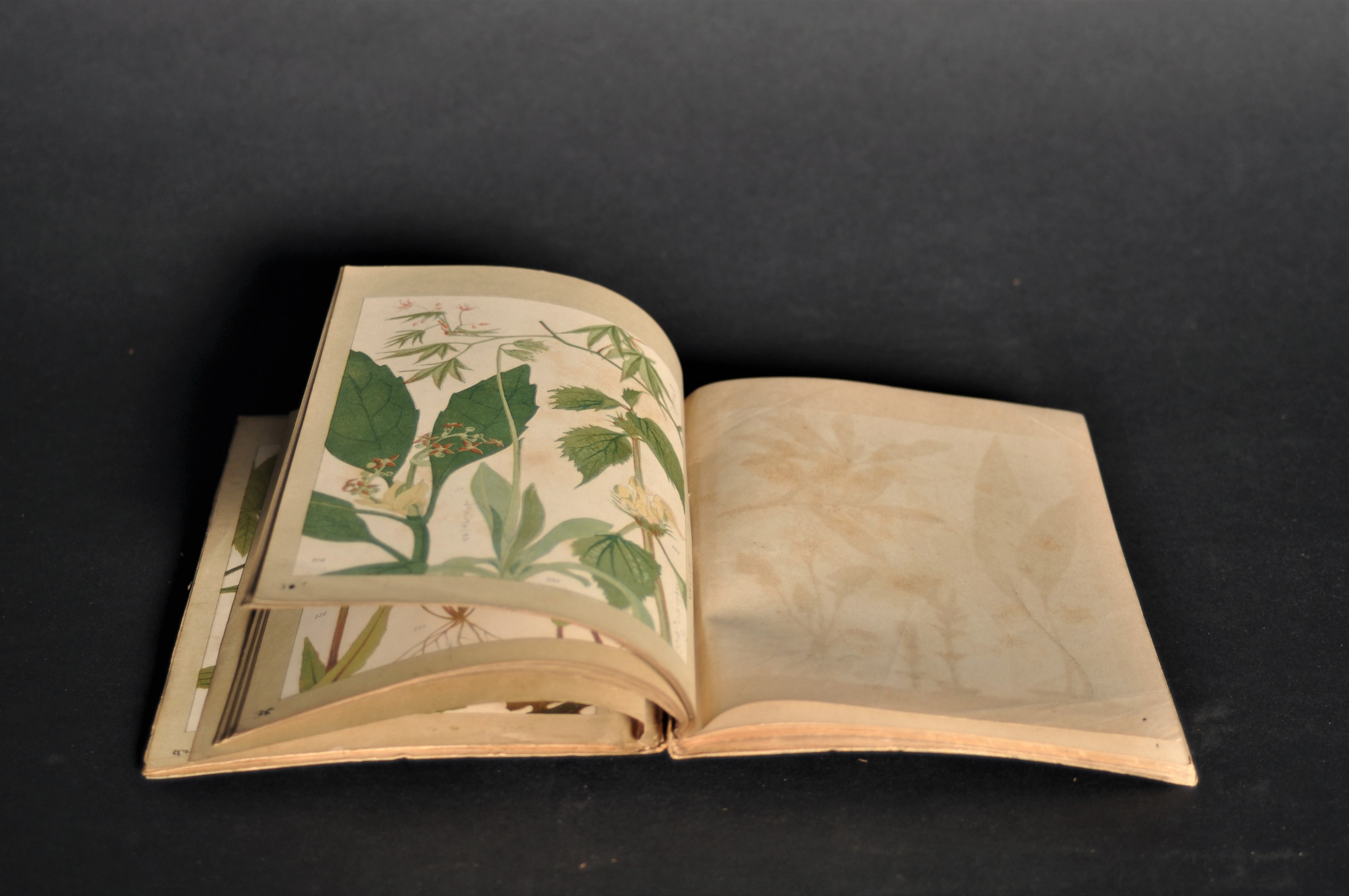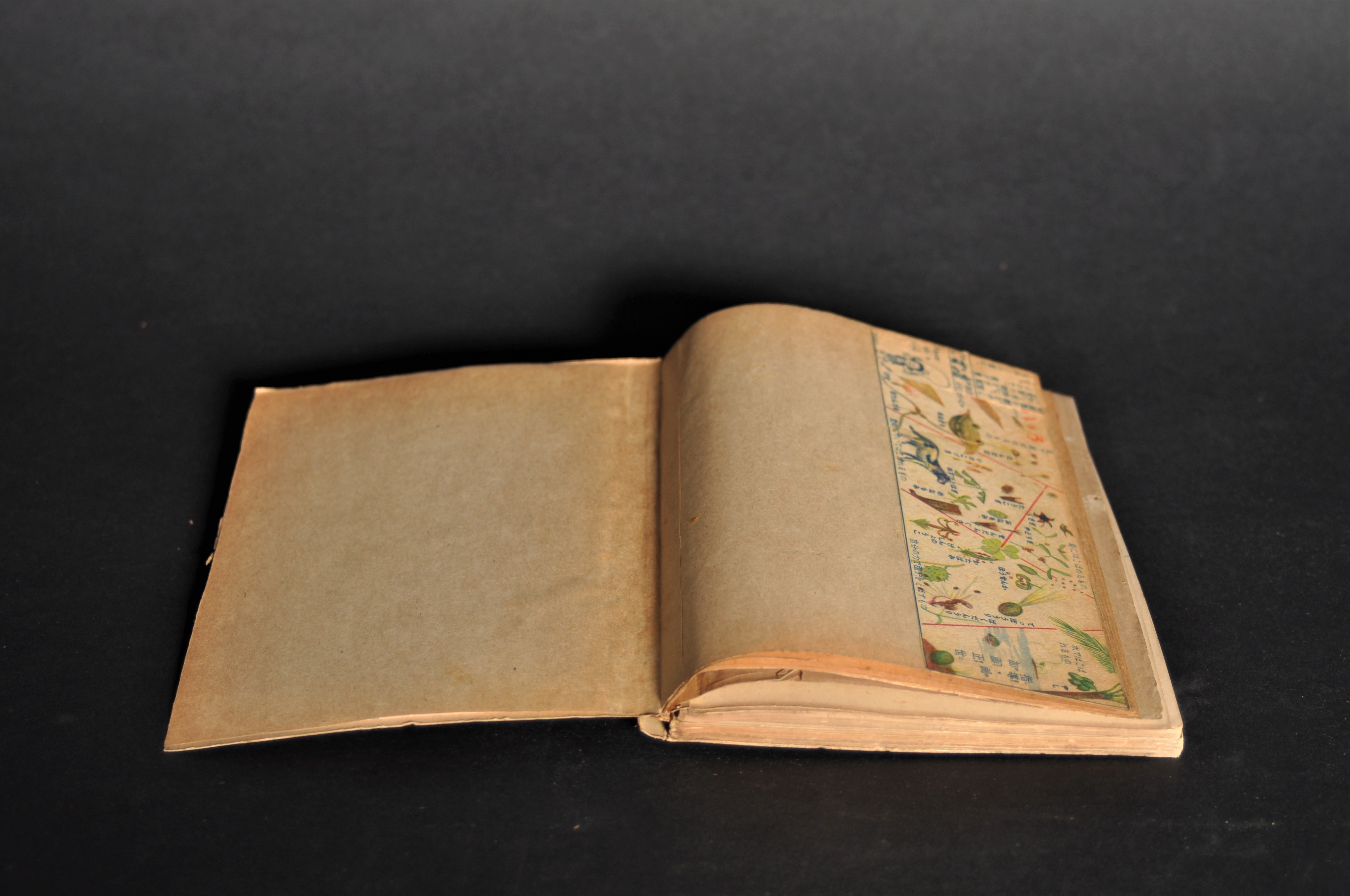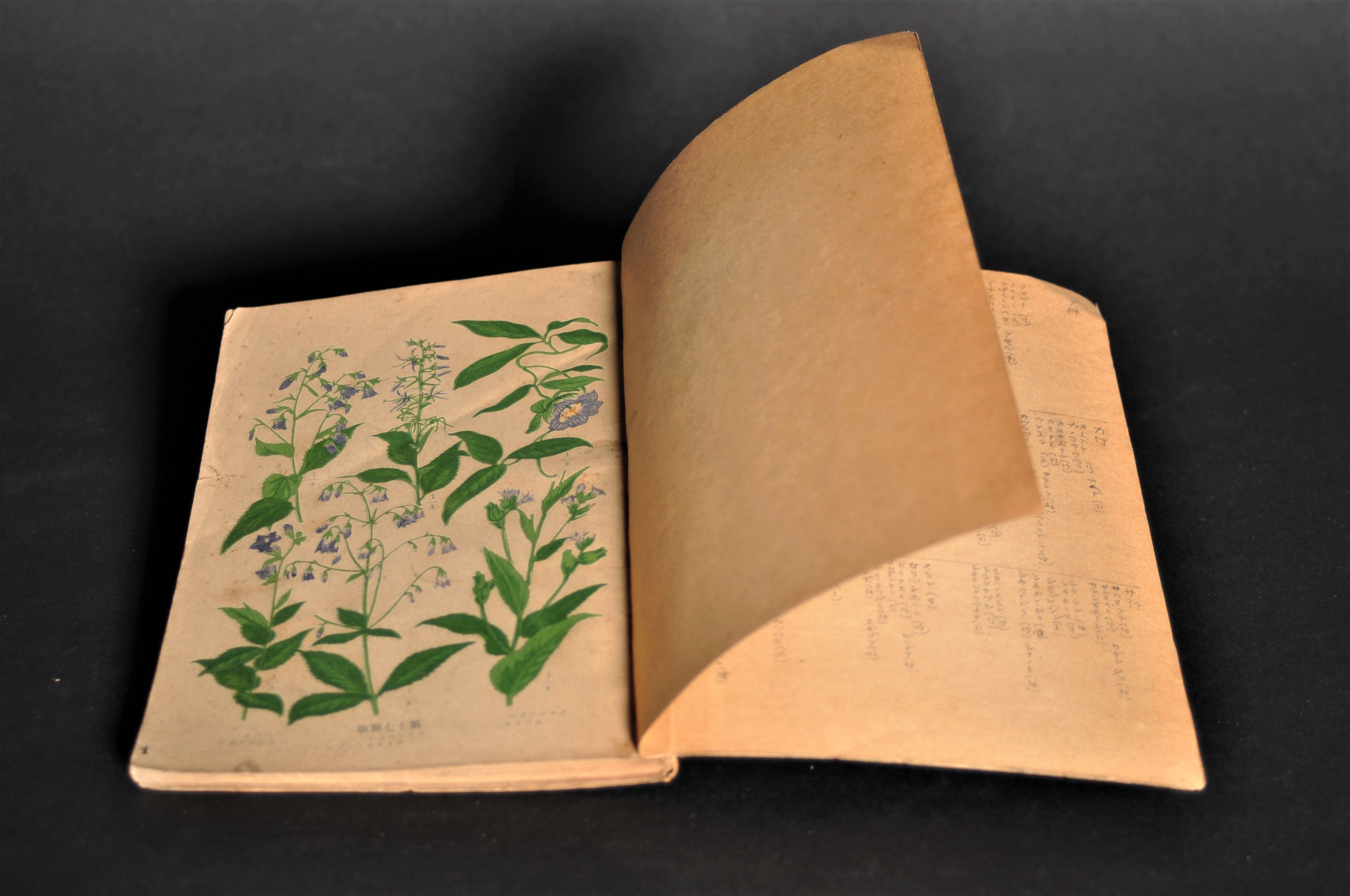 植物図鑑らしき冊子(部分)に表紙、目次をつけ、さらに他の図柄を貼り込んでいる。こうした例は時々見られる。