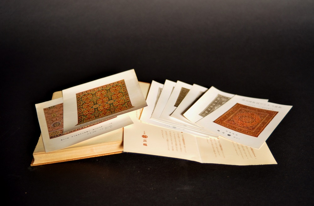 日本橋三越という名前の入った二つ折パンフレットとともに、「新着ペルシャ絨毯陳列會 十一月十六日より 二十一日まで」などと記載のある陳列品写真が挟み込まれている。